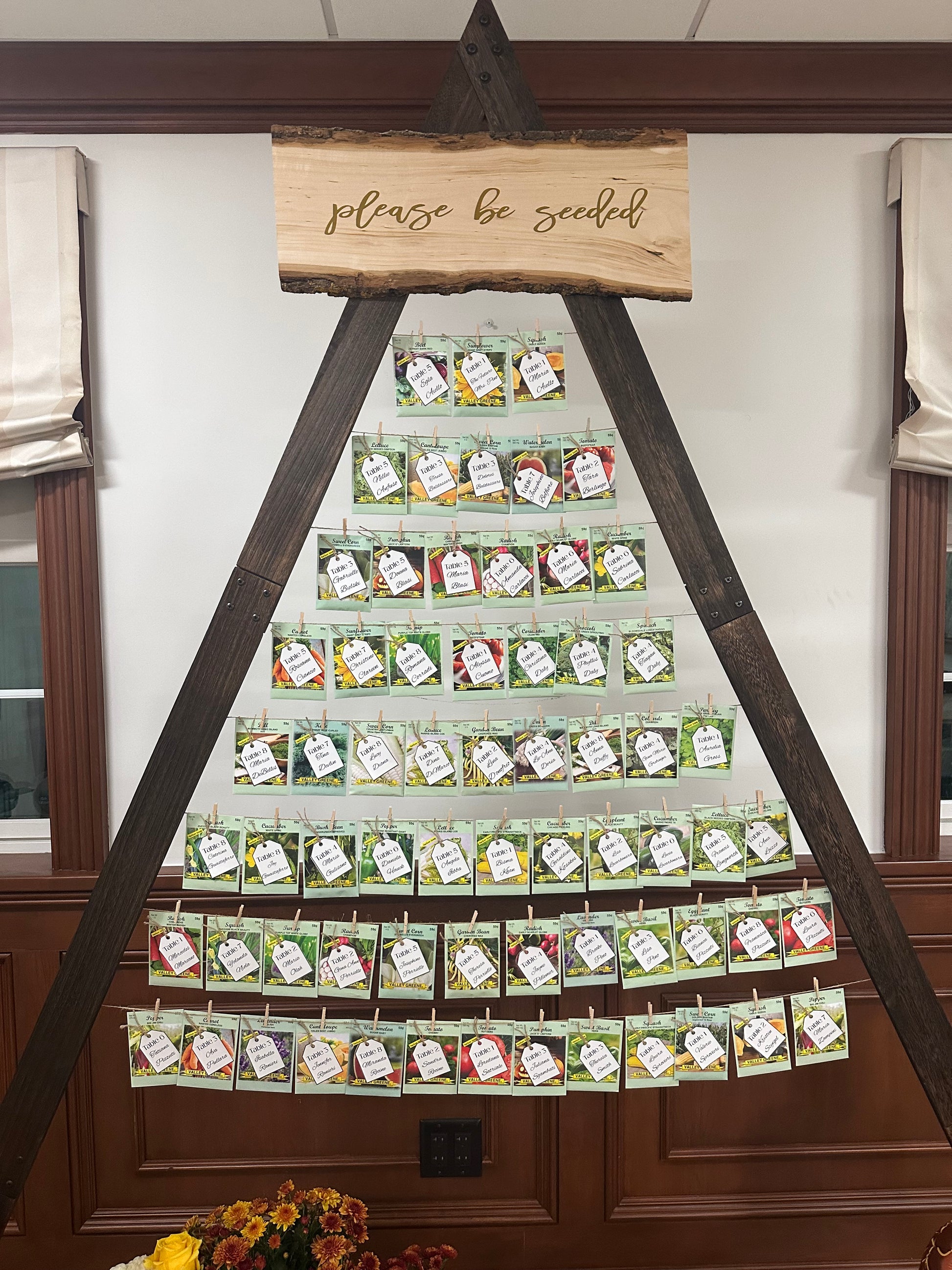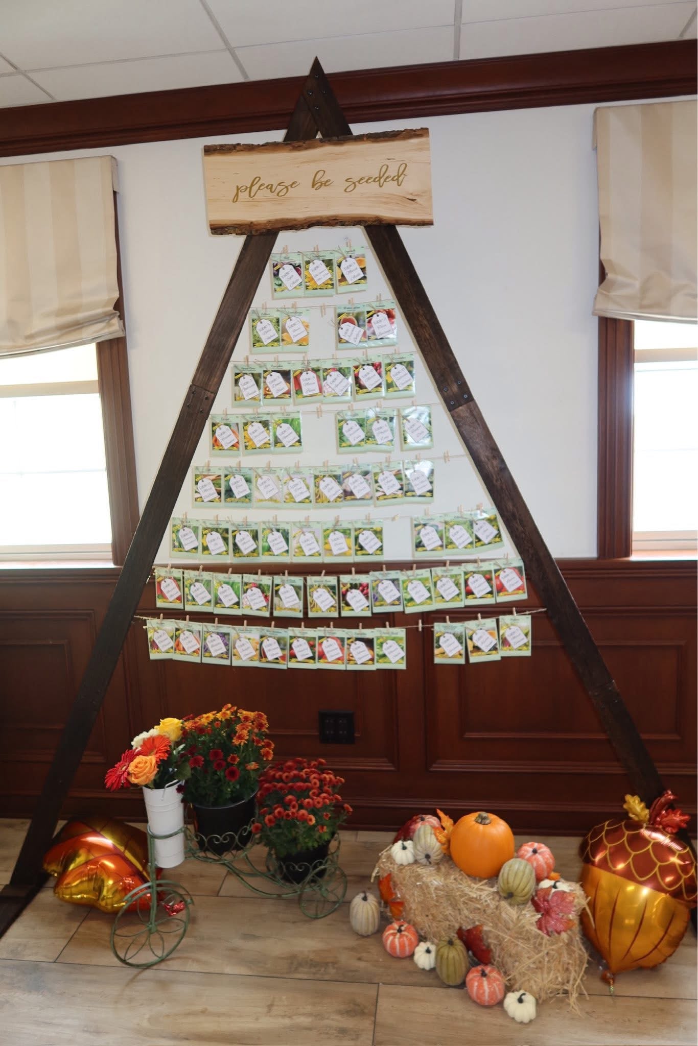 Please Be Seeded seating chart perfect for a floral themed event. Base stands 8' 3" tall (can be made shorter). Personalized sign at top. Piece can fit 65-100 place cards. May add faux florals or balloons to base.